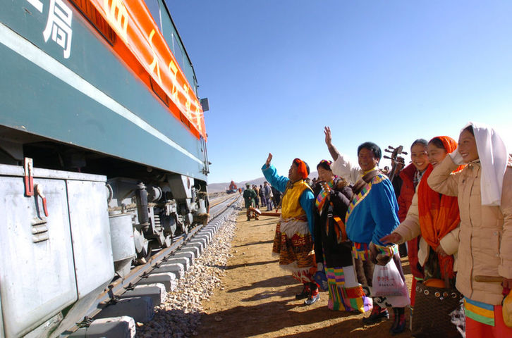 2004年10月10日,藏北群眾迎接火車抵達(dá)那曲。10月9日,青藏鐵路安多到那曲138公里的鋪軌完成。10月10日,從安多出發(fā)的西藏境內(nèi)第一列火車上午10點抵達(dá)藏北重鎮(zhèn)——那曲鎮(zhèn)。