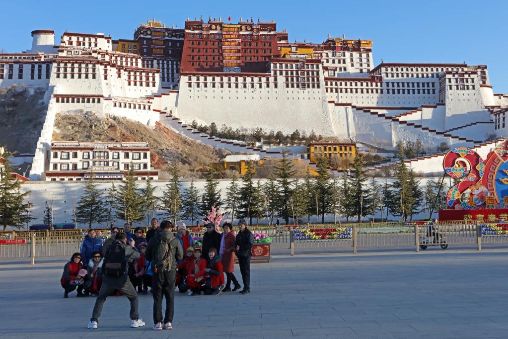 2022年3月7日,游客在布達(dá)拉宮廣場(chǎng)合影留念。新華社記者 姜帆 攝