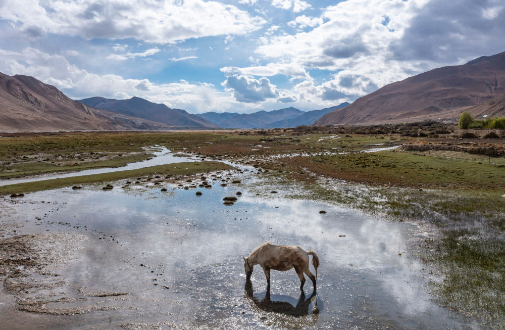 馬兒在扎西宗鄉(xiāng)的濕地里吃草(2022年5月11日攝)。
