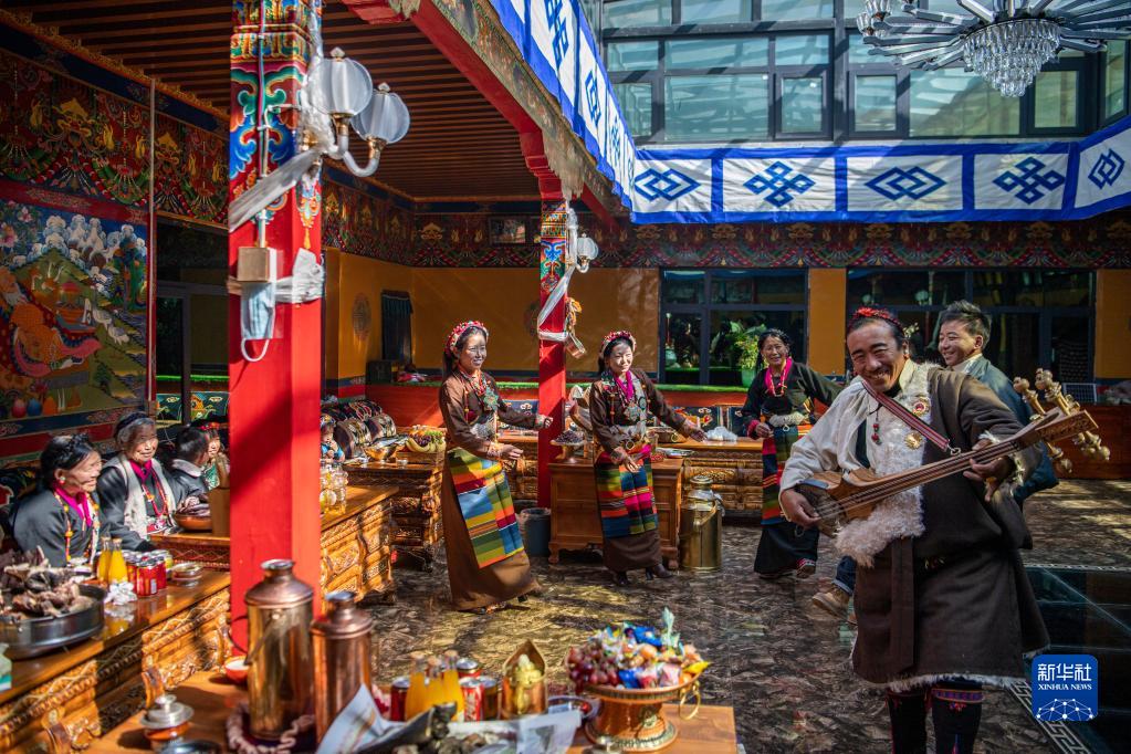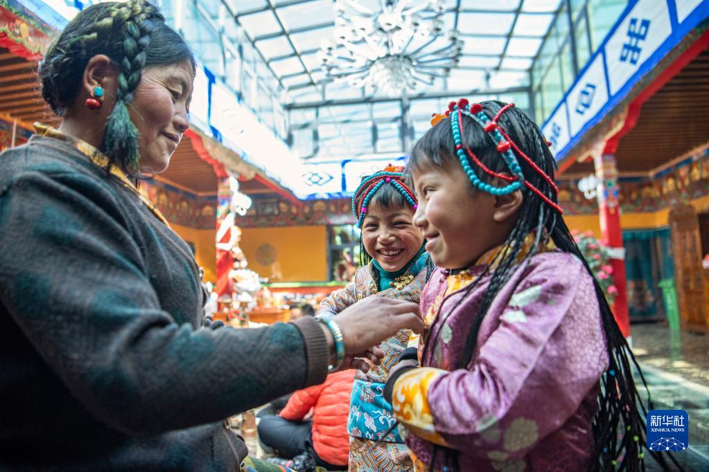 今年,日喀則藏歷農(nóng)家年和春節(jié)“巧遇”同一天,雖習(xí)俗不同,但年味皆濃。次旦的兒孫早早開車去縣城采買了年貨,兒媳婦們在家準(zhǔn)備過年吃的羊頭、切瑪?shù)葌鹘y(tǒng)特色美食。家中的第四代,次旦老人的重孫子和重孫女們,則穿上了漂亮的藏裝,頭戴綠松石點綴的頭飾,在家中歡快地跑來跑去。