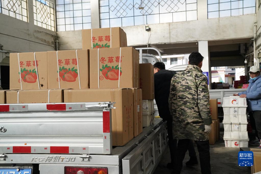 東嘎批發(fā)市場(chǎng)里,員工們正將水果搬上車廂(1月28日攝)。新華社記者黃耀漫 攝