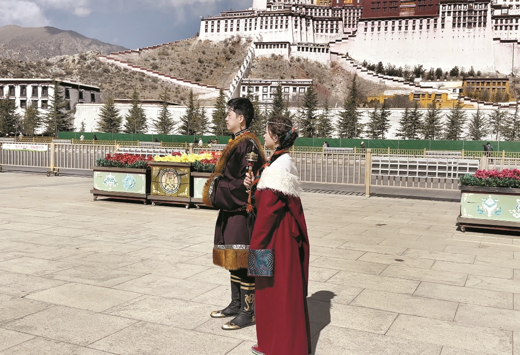 圖為游客穿著民族服裝在布達(dá)拉宮廣場(chǎng)拍照留念。 拉薩融媒記者 次仁卓嘎攝