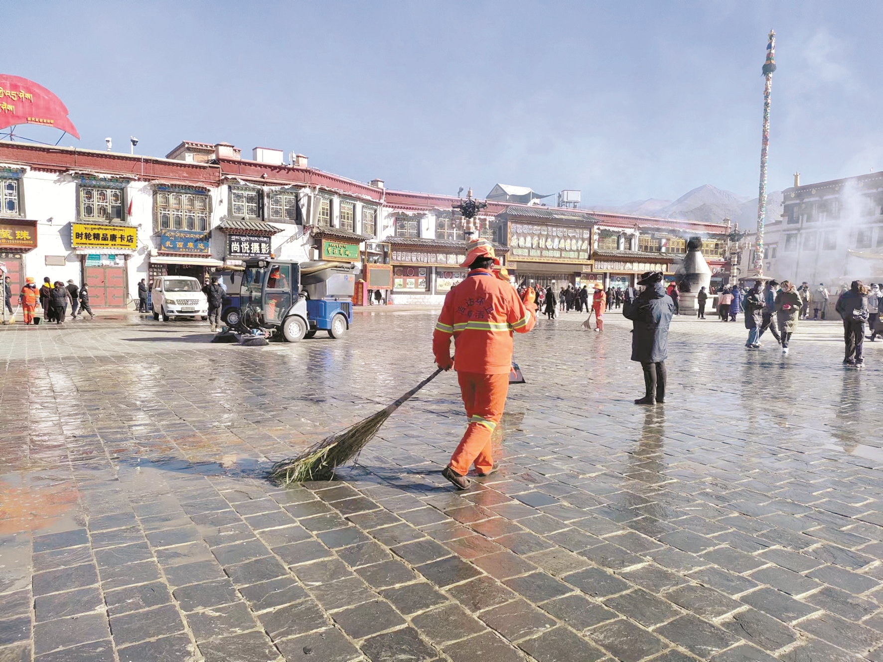 “今天,針對(duì)大昭寺廣場(chǎng)衛(wèi)生整治,我們一共出動(dòng)了20余名保潔人員,還有一臺(tái)小高壓沖洗車和兩臺(tái)小型機(jī)掃車。通過人機(jī)結(jié)合的方式,對(duì)廣場(chǎng)進(jìn)行徹底的衛(wèi)生大掃除,希望在藏歷新年期間,為市民營造一個(gè)良好的衛(wèi)生環(huán)境?!蔽鞑夭┤瓠h(huán)衛(wèi)服務(wù)有限公司督察員強(qiáng)巴偉色介紹說。