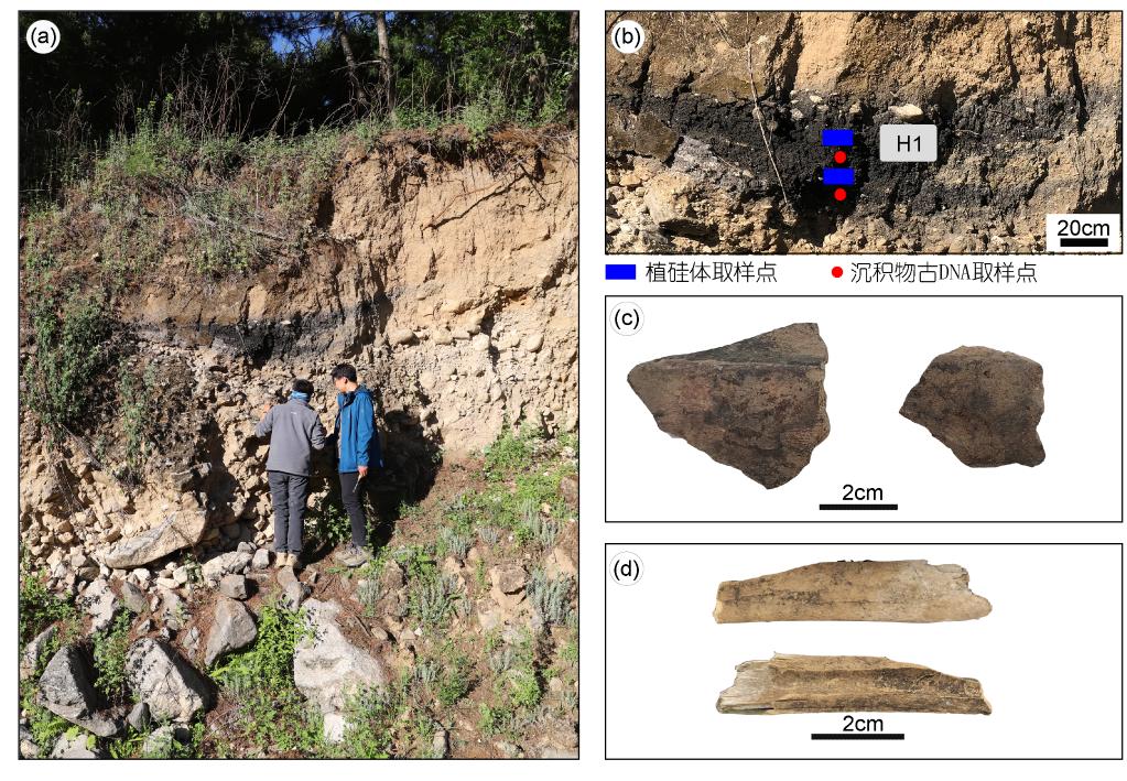 圖(a)孔桑橋遺址調(diào)查剖面圖;圖(b)采樣位置;圖(c)調(diào)查剖面出土陶片;圖(d)調(diào)查剖面出土動物骨骼。(資料圖片由聯(lián)合科考隊提供)