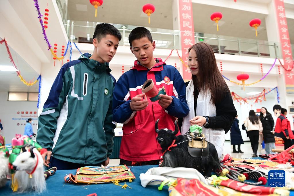 2月21日,在西安市浐灞第一中學(xué)舉行的藏歷新年團(tuán)拜活動(dòng)上,家長(zhǎng)和學(xué)生參觀藏族文化展。新華社記者 李一博 攝
