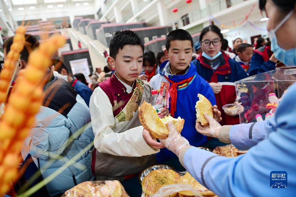 2月21日,在西安市浐灞第一中學(xué)舉行的藏歷新年團(tuán)拜活動(dòng)上,學(xué)生品嘗特色小吃。新華社記者 李一博 攝
