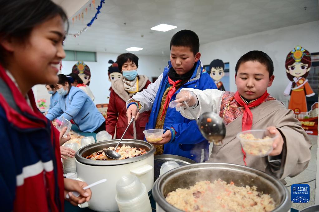 2月21日,在西安市浐灞第一中學(xué)舉行的藏歷新年團(tuán)拜活動(dòng)上,漢藏學(xué)生品嘗特色小吃。新華社記者 李一博 攝