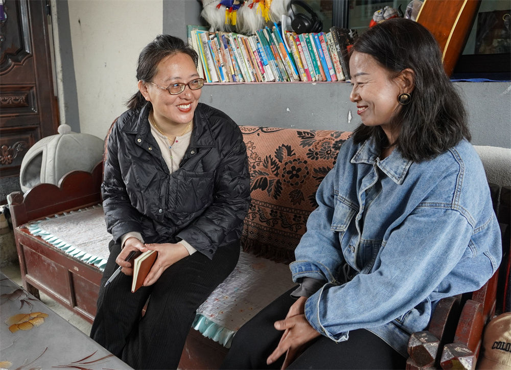 在西藏墨脫縣德興鄉(xiāng)德興村,白瑪曲珍(左)在村民格桑曲珍家了解手工藝品制作和銷路情況(2月19日攝)。新華社記者 王澤昊 攝