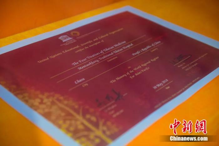 藏醫(yī)著作《四部醫(yī)典》入選《世界記憶亞太地區(qū)名錄》證書(shū)。貢嘎來(lái)松 攝