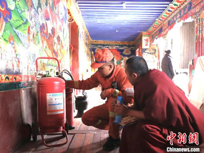 森林消防隊(duì)員為僧人講解滅火器使用方法?!∥骼@拉翁 攝