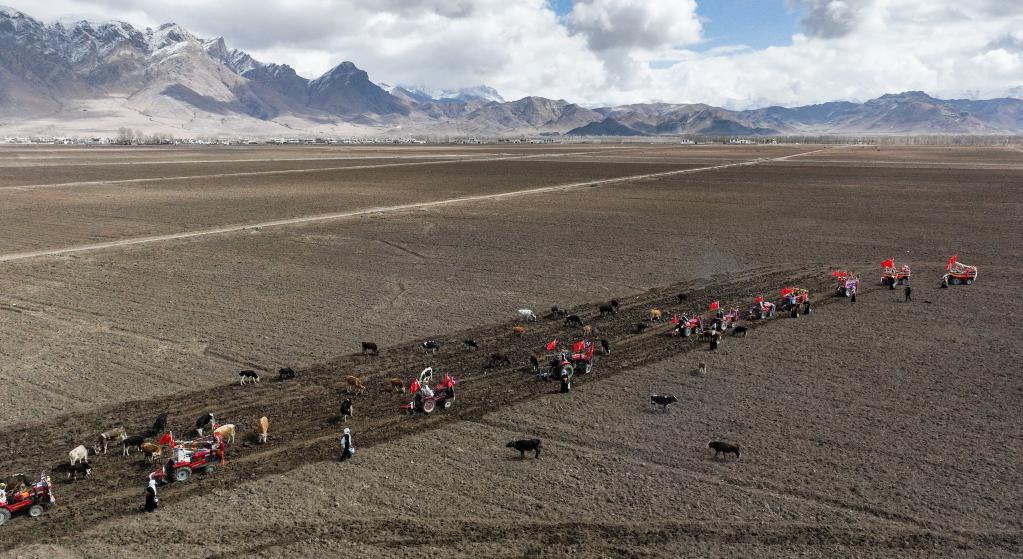 西藏林周縣強嘎村的春耕儀式(無人機照片)(3月16日攝)。新華社記者 晉美多吉 攝