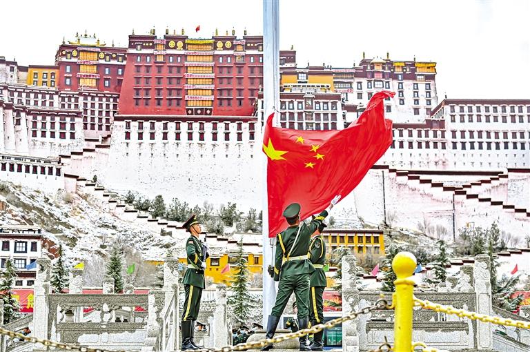 圖為拉薩市舉行“升國旗、唱國歌”儀式,隆重紀念西藏百萬農(nóng)奴解放64周年。記者 潘多 攝