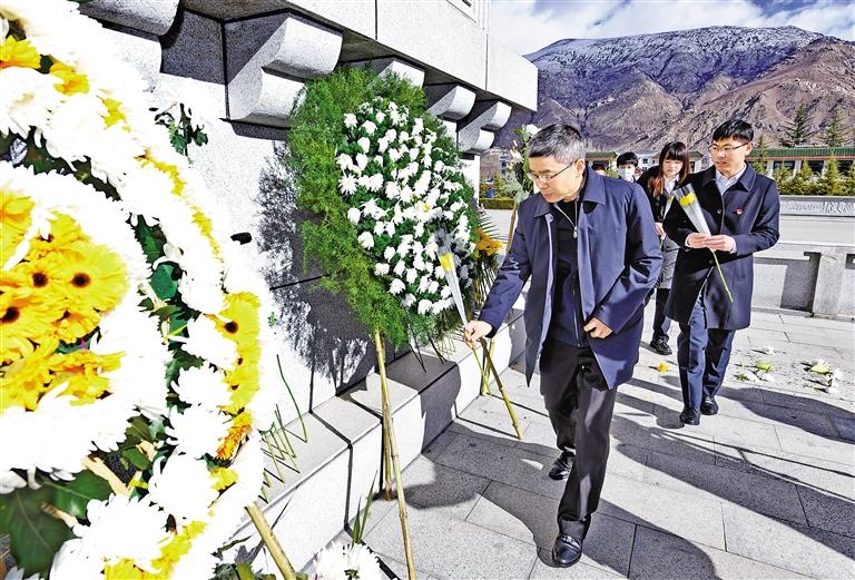 4月2日上午,西藏高爭民爆股份有限公司員工向革命烈士紀(jì)念碑敬獻(xiàn)鮮花,表達(dá)對先烈們的緬懷之情。何琪 記者 唐斌 攝