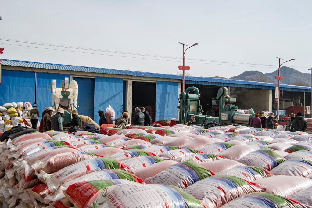 在西藏日喀則市江孜縣紫金鄉(xiāng)努堆村的農(nóng)機(jī)農(nóng)民專業(yè)合作社內(nèi),兩臺(tái)青稞種谷物精選機(jī)正開足馬力,給新收獲的青稞良種過篩、除雜、包衣、裝袋,50公斤一袋的青稞良種已碼滿大半個(gè)院子。