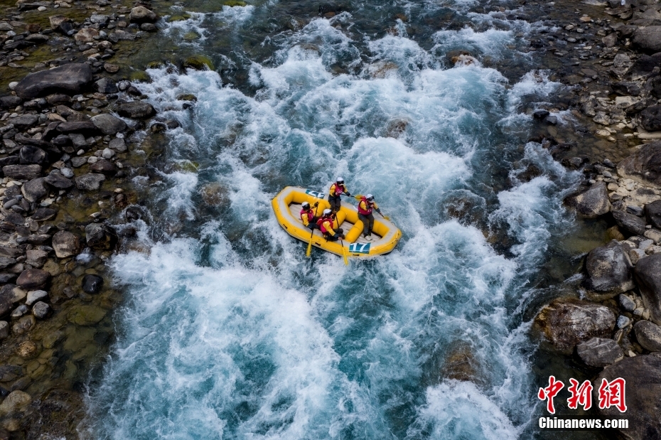 圖為激流漂流筏追逐賽比賽現(xiàn)場(chǎng)。(無人機(jī)照片)中新社記者 貢嘎來松 攝