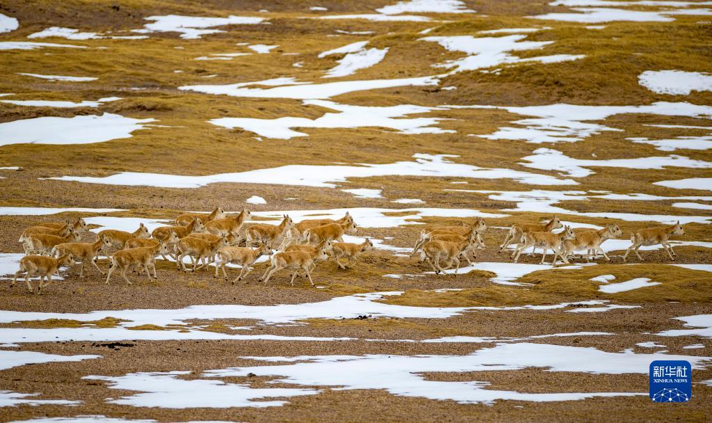 這是在羌塘國家級(jí)自然保護(hù)區(qū)那曲市雙湖縣區(qū)域內(nèi)拍攝到的藏羚羊群(4月17日攝) 。新華社記者 姜帆 攝