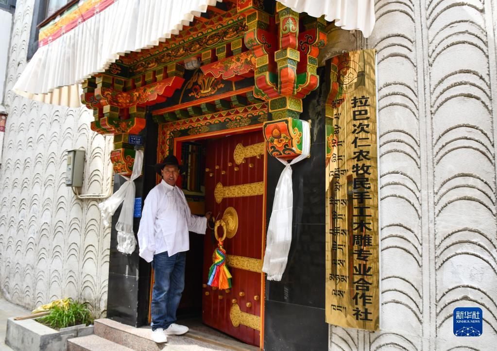 拉巴次仁在農牧民手工木雕專業(yè)合作社門前(4月25日攝)。新華社記者 晉美多吉 攝