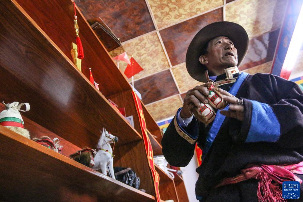 索朗群培展示他制作的馬包(4月18日攝)。新華社記者 劉洲鵬 攝