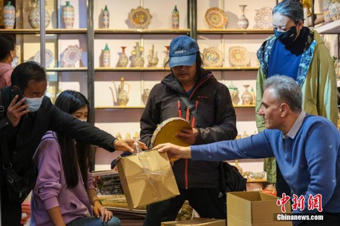 5月4日,西藏(拉薩)中外商品展銷(xiāo)會(huì)現(xiàn)場(chǎng),伊朗商戶(hù)哈桑(前排右)給顧客打包好商品,后面貨架是他銷(xiāo)售的伊朗特色工藝品。中新社記者 江飛波 攝