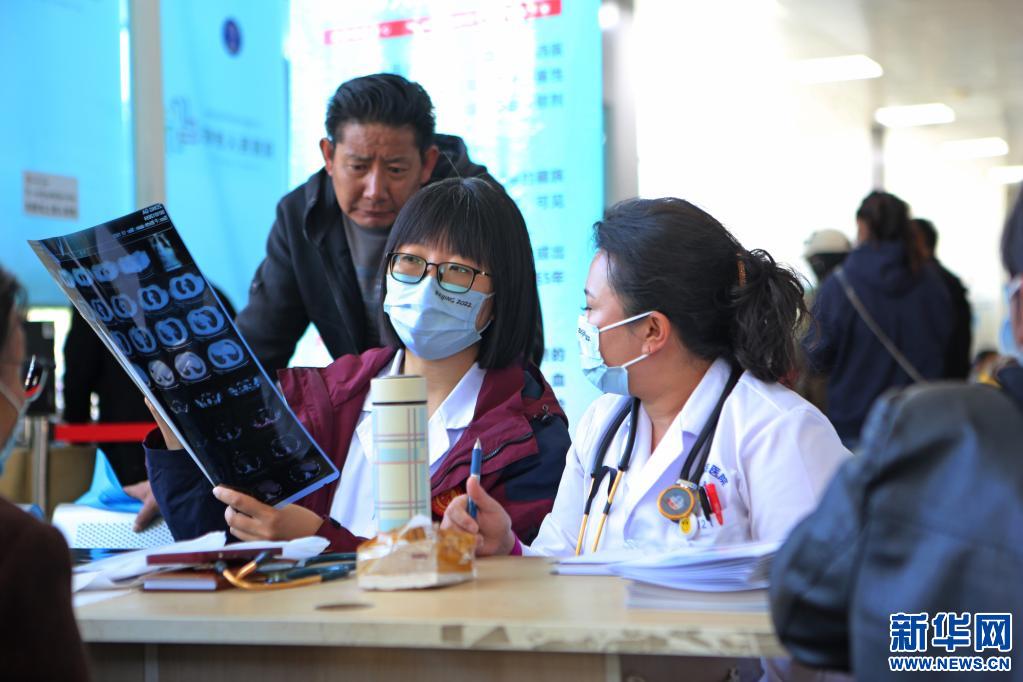 圖為“京藏?cái)y手,護(hù)佑藍(lán)唇”義診活動(dòng)現(xiàn)場,楊蘇喬醫(yī)生(左一)在為患者診治疾病。(5月5日攝)