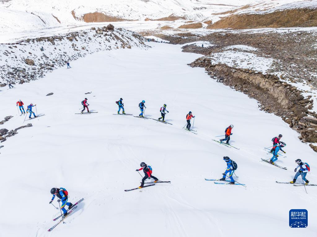 在西藏拉薩市當(dāng)雄縣羊八井鎮(zhèn),玉珍拉姆(前排左二)和隊(duì)友進(jìn)行滑雪登山訓(xùn)練(5月2日攝,無(wú)人機(jī)照片)。新華社記者 孫非 攝