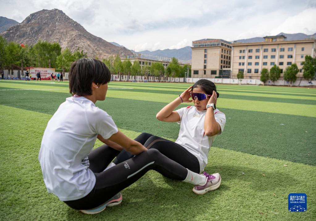 在西藏自治區(qū)體育運(yùn)動(dòng)技術(shù)學(xué)校,玉珍拉姆(右)在訓(xùn)練中做仰臥起坐(4月29日攝)。新華社記者 孫非 攝