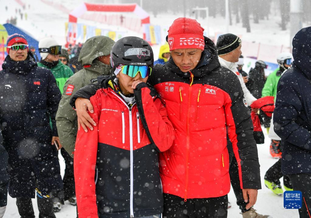 在全國(guó)首屆滑雪登山冠軍賽短距離(女子組)比賽后,西藏代表隊(duì)教練組人員安慰在比賽中失誤的玉珍拉姆(前左)(4月8日攝)。新華社記者 胡虎虎 攝