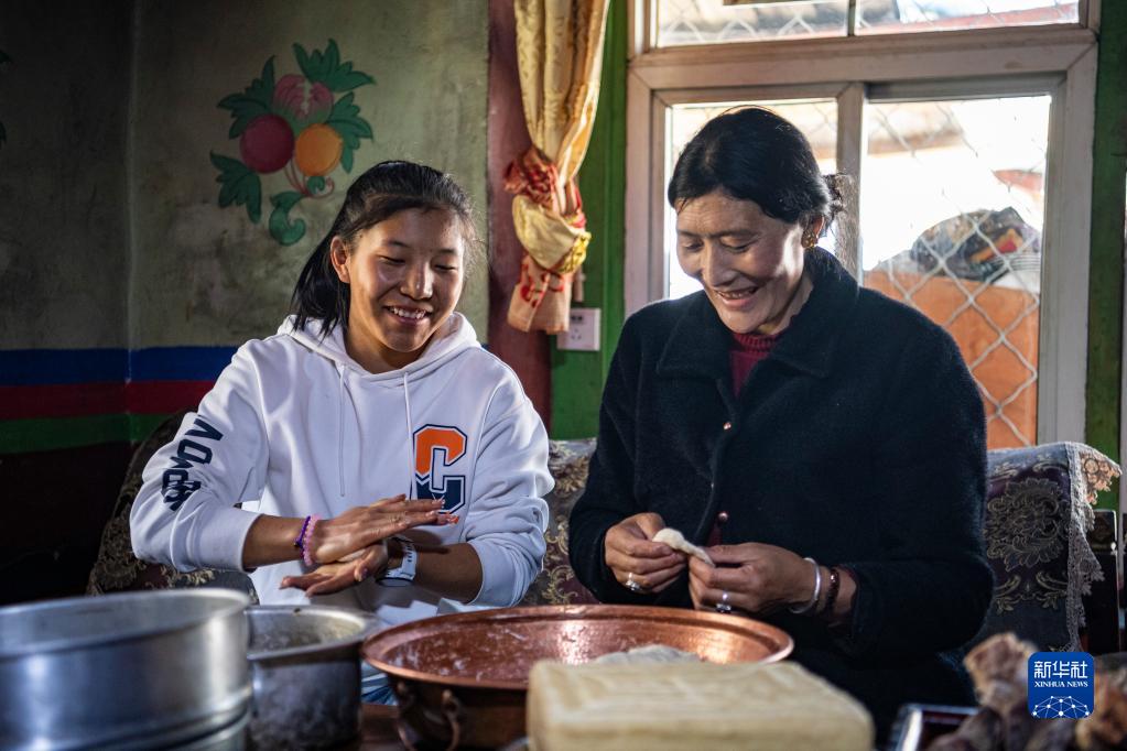在位于西藏林芝市工布江達(dá)縣仲莎鄉(xiāng)的家中,玉珍拉姆(左)和媽媽一起做土豆包子(4月24日攝)。新華社記者 孫非 攝
