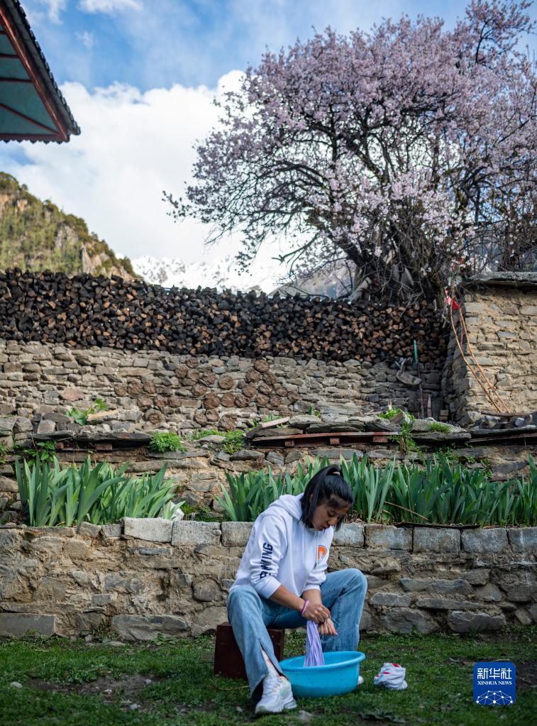 在位于西藏林芝市工布江達(dá)縣仲莎鄉(xiāng)的家中,玉珍拉姆在院子里洗衣服(4月24日攝)。新華社記者 孫非 攝