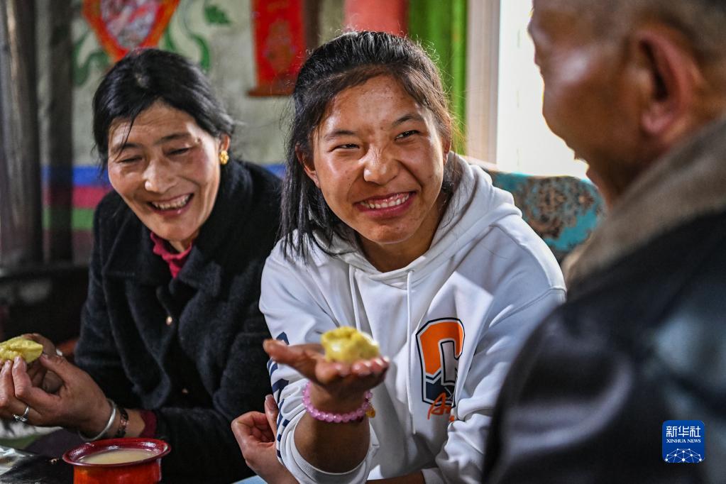 在位于西藏林芝市工布江達(dá)縣仲莎鄉(xiāng)的家中,玉珍拉姆(中)向爸爸展示自己做的土豆包子(4月24日攝)。新華社記者 孫非 攝