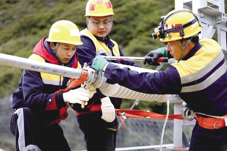 “高空作業(yè),大家把安全帽戴好!”彭江江不時(shí)提醒道。王偉點(diǎn)頭示意回應(yīng)工長(zhǎng)彭江江,隨后輕車熟路地將安全帶系在斜腕臂上,右手緊緊抓住上方的腕臂,右腳跨上懸空的定位管,左腳一蹬,穩(wěn)穩(wěn)地站在了斜腕臂上。工友蔣瀟和次仁加布也嫻熟地爬了上來,他們動(dòng)作靈活協(xié)調(diào),身手敏捷矯健,整個(gè)過程連貫一通,無一點(diǎn)拖泥帶水。