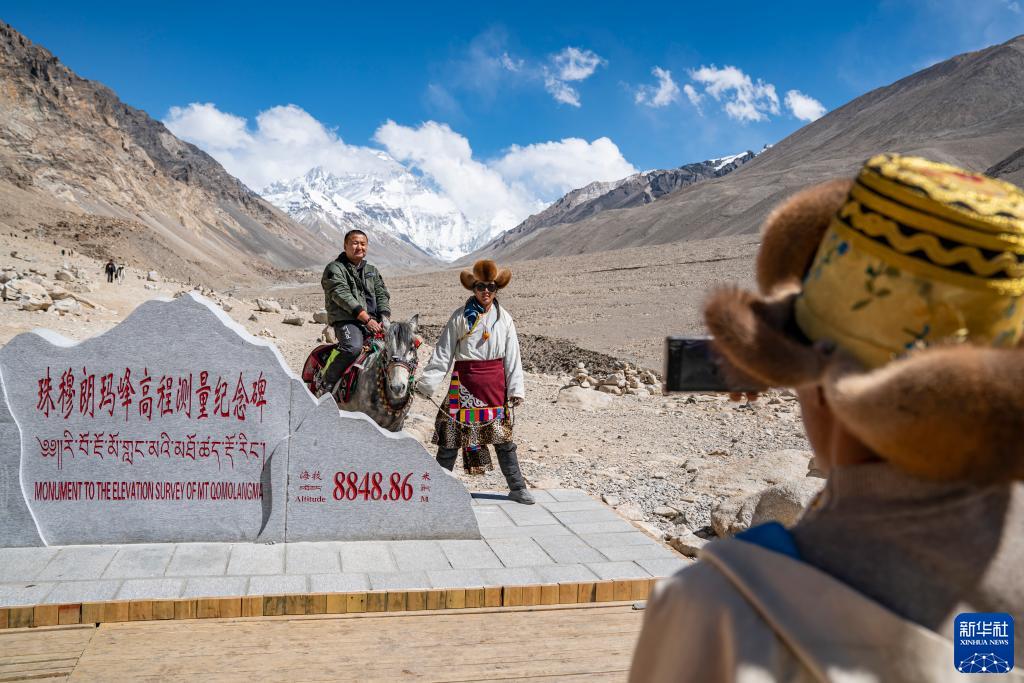 在珠峰大本營的珠峰高程測(cè)量紀(jì)念碑前,游客拍照留念(5月20日攝)。新華社記者 孫非 攝