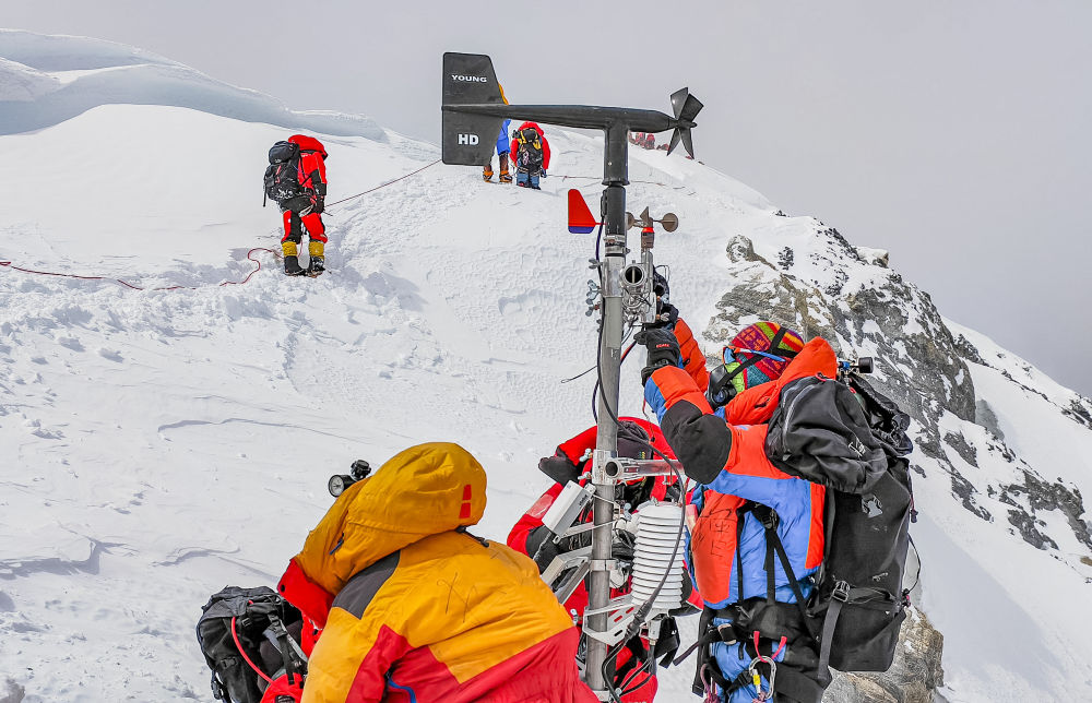 當(dāng)日凌晨3時(shí),科考隊(duì)員從海拔8300米的突擊營(yíng)地出發(fā),歷經(jīng)數(shù)小時(shí)攀登,終于抵達(dá)海拔8830米的世界最高自動(dòng)氣象觀測(cè)站。固定鋼筋繩索,更換蓄電池,安裝風(fēng)速風(fēng)向傳感器……經(jīng)過(guò)約1小時(shí)的緊張工作,氣象站零部件升級(jí)工作全部完成。隨后,他們攀登至8848.86米的峰頂,利用工具成功采集雪冰樣品。