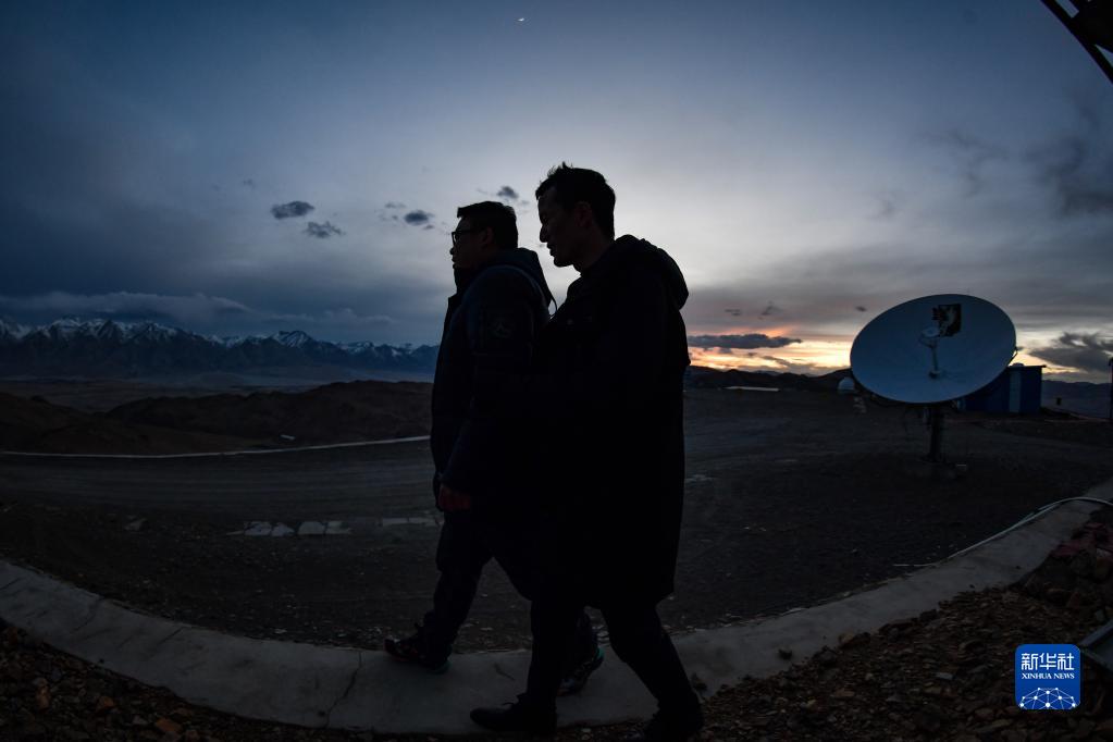 尤顯龍(左)和同事唐鵬在討論觀測到的數(shù)據(jù)(5月23日攝)。新華社記者 晉美多吉 攝