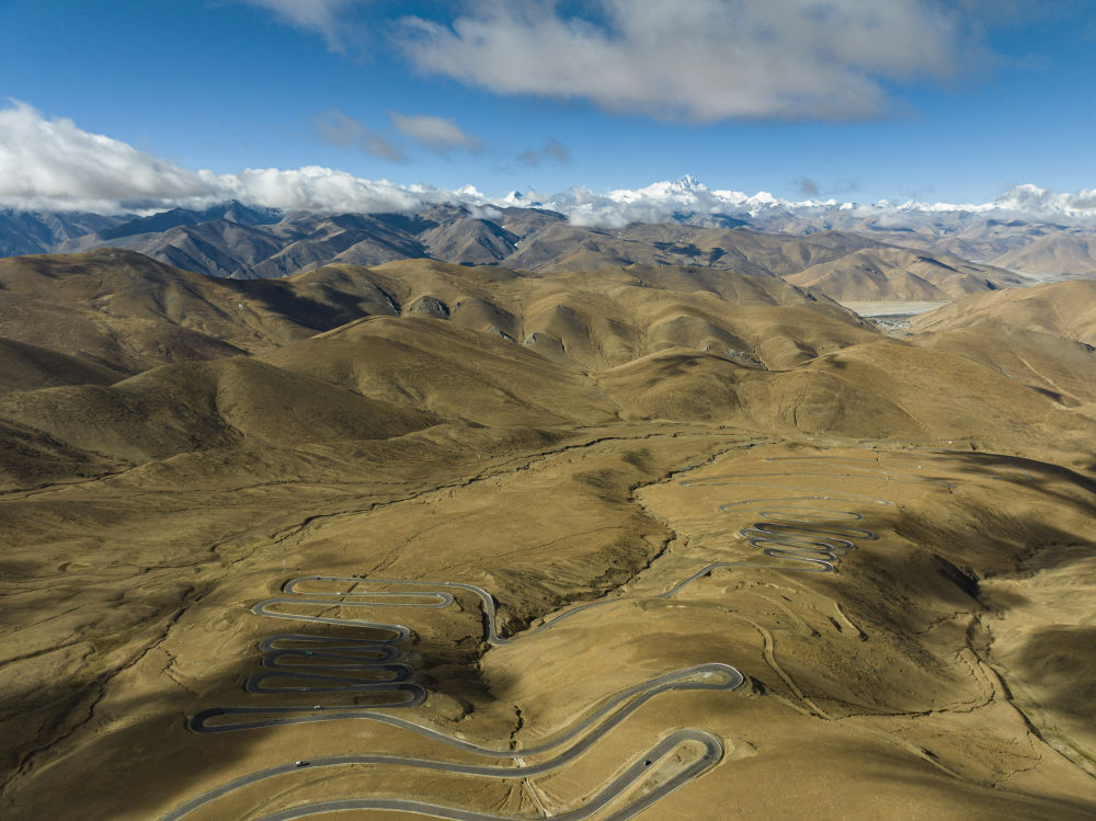 這是在海拔6000米左右高空拍攝的通往珠峰的公路(5月26日攝,無人機照片)。新華社發(fā)(旦增努布 攝)