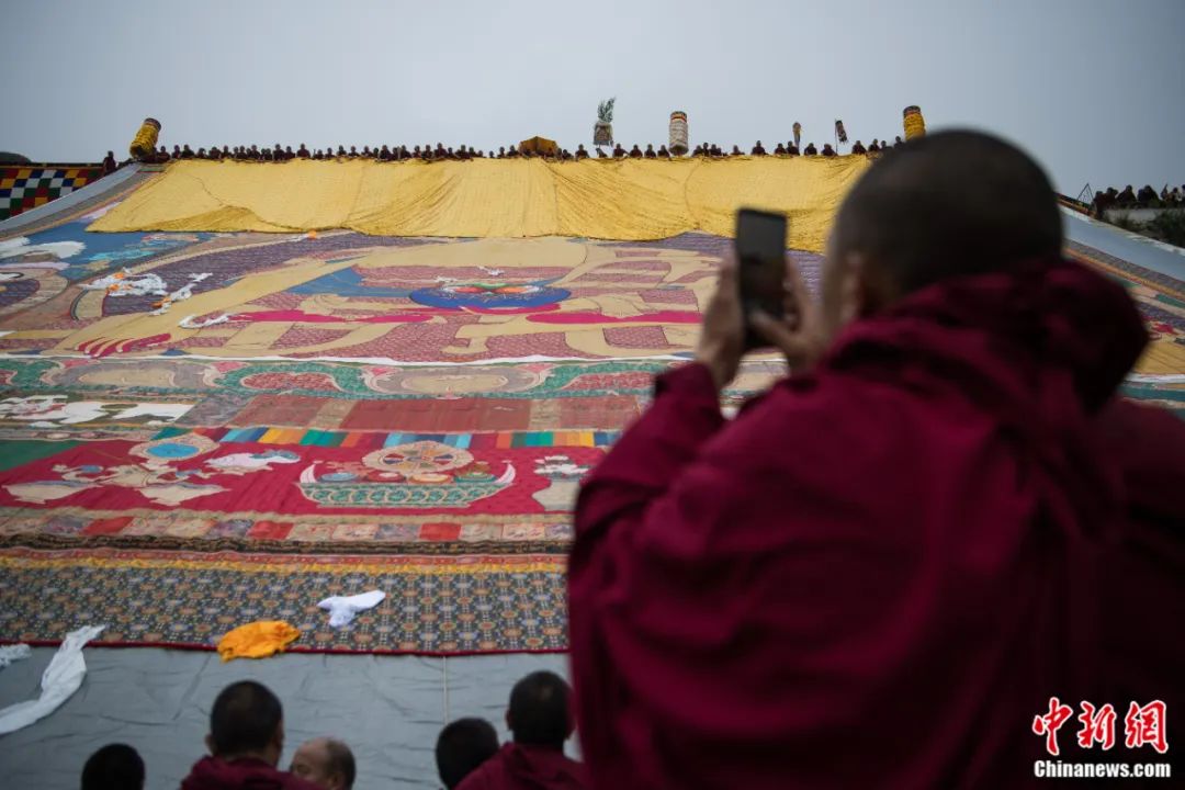 西藏拉薩哲蚌寺舉行展佛活動,僧人用手機(jī)記錄。何蓬磊 攝