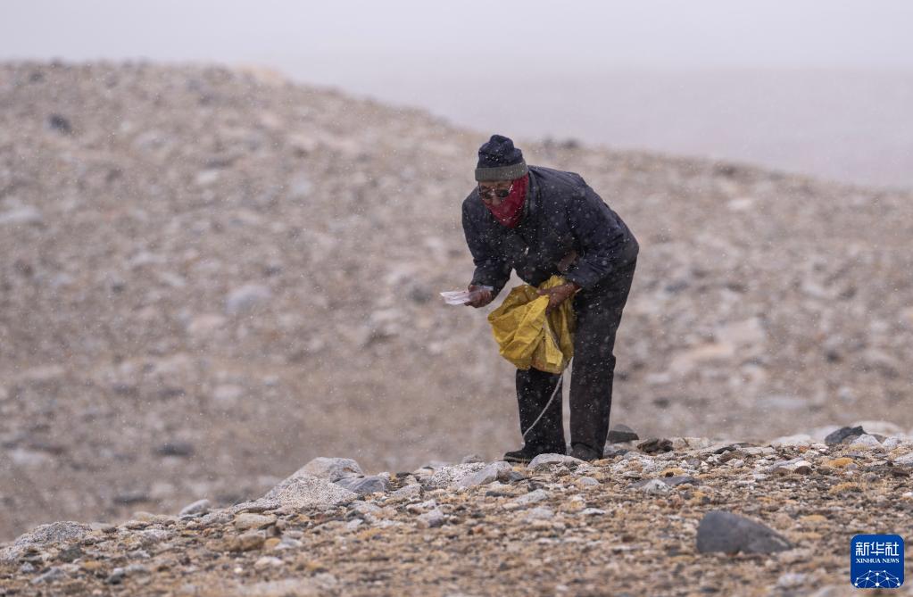 5月31日,乃乃老人在杰瑪央宗冰川附近撿拾垃圾。新華社記者 費(fèi)茂華 攝