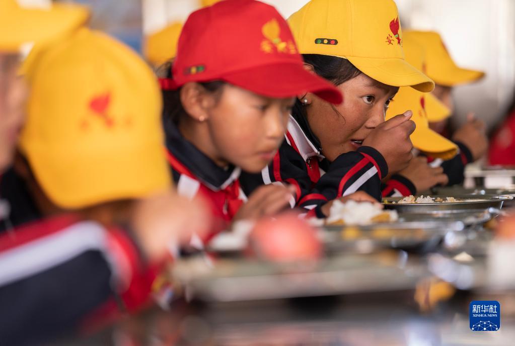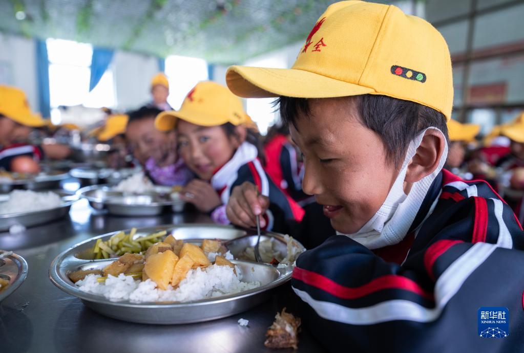 6月5日,扎西宗鄉(xiāng)完全小學(xué)的學(xué)生在食堂吃午飯。新華社記者 費(fèi)茂華 攝