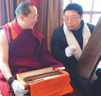 項目總顧問丁真俄色(左)與西藏自治區(qū)古籍保護(hù)中心研究館員、古籍專家白張?zhí)接懝偶Wo(hù)。