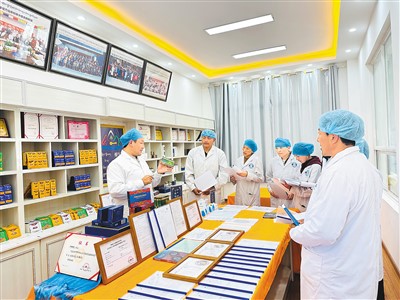 平措饒吉(左一)在介紹作為項目成果轉(zhuǎn)化的藏醫(yī)藥品。