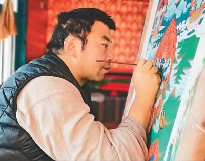 象雄唐卡畫家嘎松旺加在繪畫唐卡。據(jù)介紹,唐卡畫風(fēng)的傳承最早可追溯到古象雄時期,其佛像繪制主要依據(jù)了《古象雄大藏經(jīng)》中的度量法。