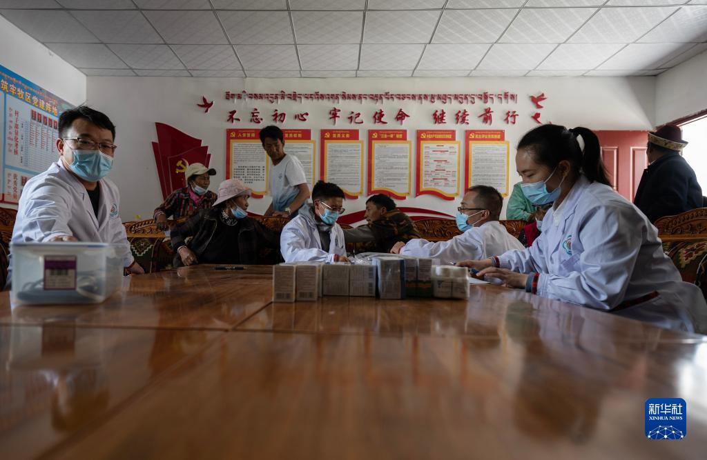 6月12日,王振疆(前右二)、王彤旭(前左一)、陳冰(前右一)和尼瑪益西(前左三)在村委會會議室為患者診治。新華社記者 費(fèi)茂華 攝
