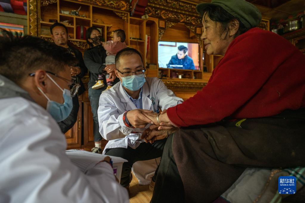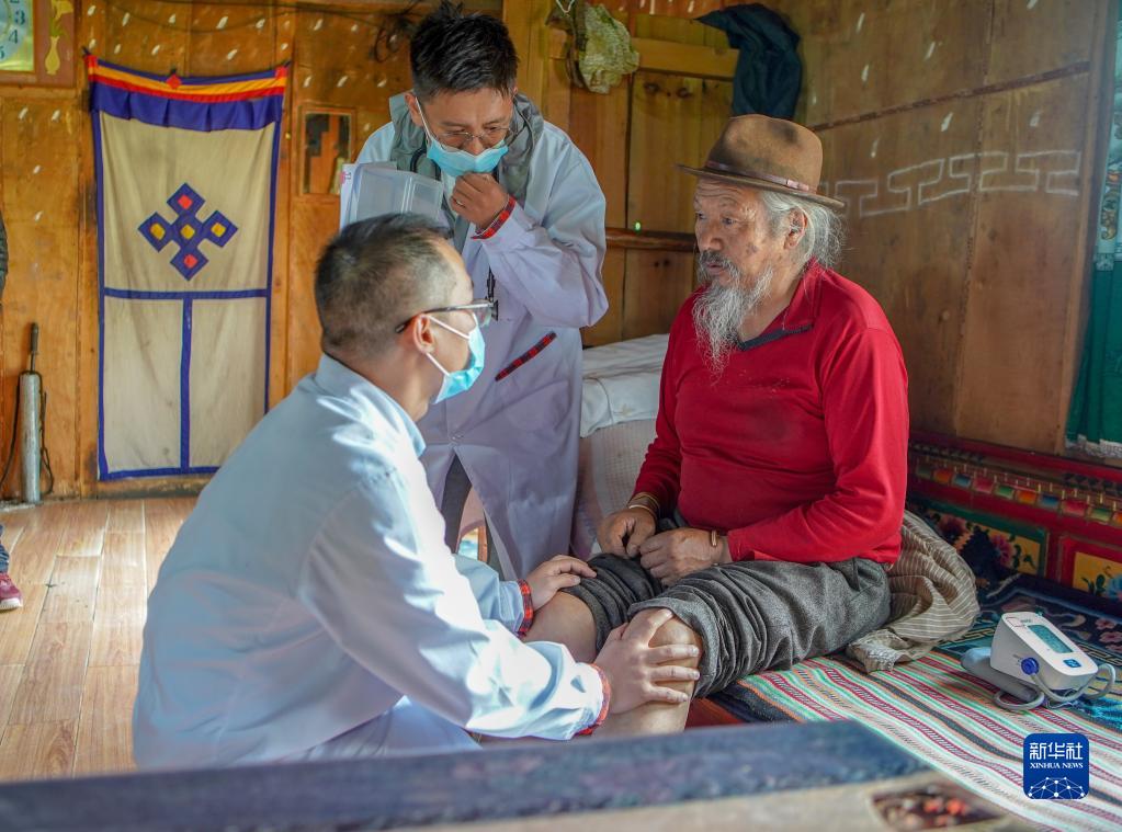 6月12日,王振疆(右)為吞不絨村89歲的村民娘姑進(jìn)行檢查。新華社記者 費(fèi)茂華 攝
