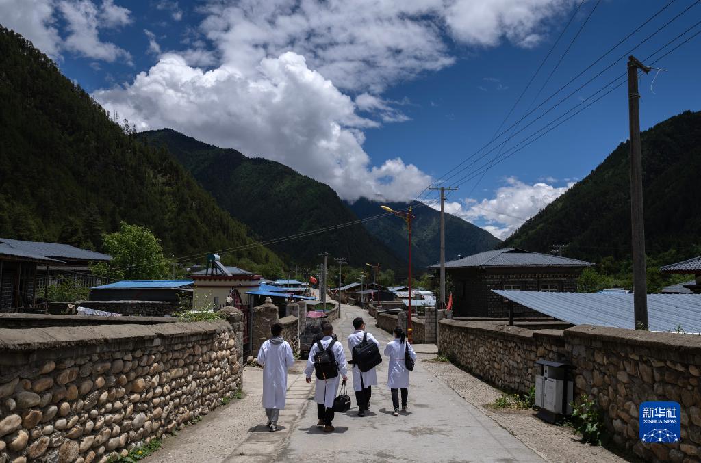 6月12日,入戶診治結(jié)束后,王振疆(左二)、王彤旭(右二)、陳冰(右一)和尼瑪益西走向村委會。新華社記者 費(fèi)茂華 攝
