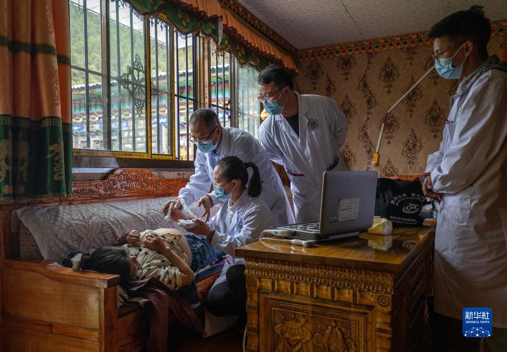 6月12日,王振疆(右一)和尼瑪益西(右下)在吞不絨村為阿珍診治。新華社記者 費(fèi)茂華 攝