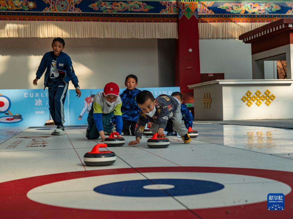 6月17日,幾名孩子在第五屆藏博會現場體驗冰壺。新華社記者 張汝鋒 攝