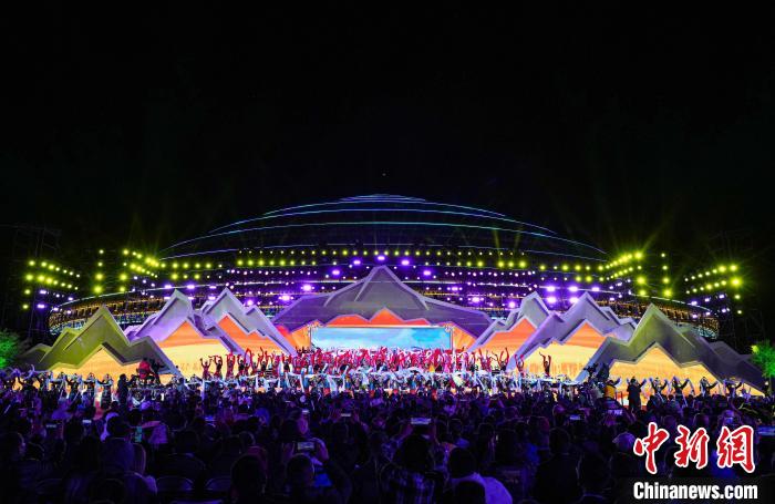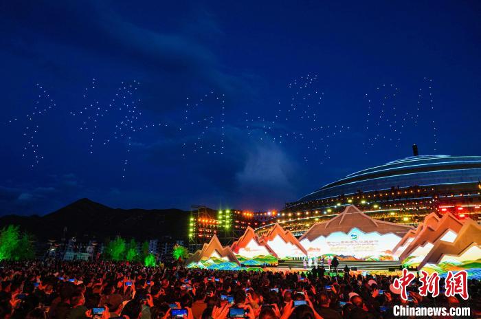 開(kāi)幕式上,由300架無(wú)人機(jī)組成的暖場(chǎng)表演在日喀則珠峰文化旅游創(chuàng)意產(chǎn)業(yè)園區(qū)上空精彩呈現(xiàn),組成“珠峰故里、吉祥日喀則,歡迎您!”等陣型。匠心獨(dú)運(yùn)的創(chuàng)意設(shè)計(jì),流光溢彩的聲光電效果,以恢弘氣勢(shì)和華麗造型,展示日喀則的開(kāi)放包容。文藝表演由序《珠峰頌歌》、上篇《戀上青稞》、下篇《極境暢想》和尾聲《吉祥日喀則》組成。聲,是情的流露;舞,是意的表達(dá)。文藝演出將民眾的生活與藝術(shù)相結(jié)合,融合傳統(tǒng)文化與現(xiàn)代歌舞等藝術(shù)形式,既富有傳統(tǒng)特色又極具時(shí)代魅力,將日喀則各族人民的喜悅和游情盡情抒發(fā),充分表達(dá)了日喀則各族人民對(duì)美好生活的熱愛(ài)和對(duì)祖國(guó)的祝福歌頌。