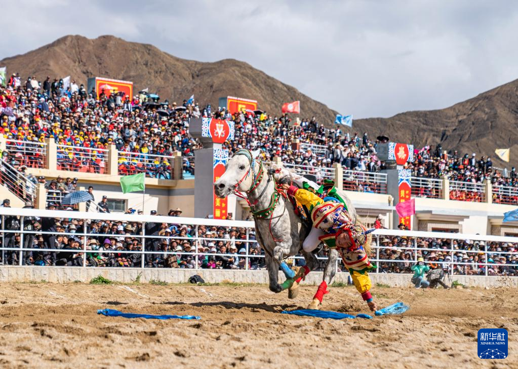 6月20日,在賽馬活動(dòng)現(xiàn)場,騎手正在表演馬上拾哈達(dá)。新華社記者 孫非 攝