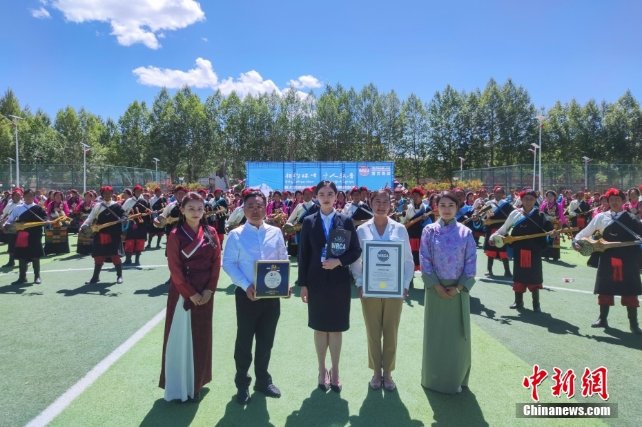 6月25日,“相約珠峰·千人弦音”西藏日喀則大型非遺歌舞展演在日喀則上海體育場舉行。經(jīng)世界紀(jì)錄認(rèn)證(WRCA)官方審核,該活動(dòng)成功創(chuàng)造“最大規(guī)模的日喀則非遺民俗舞蹈表演”世界紀(jì)錄。圖為認(rèn)證現(xiàn)場。
