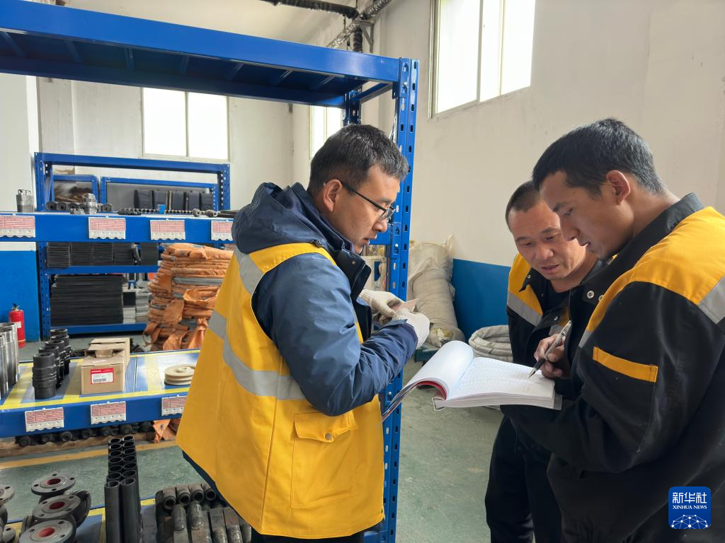 高錢勝(左一)和同事在材料庫核對應(yīng)急搶險(xiǎn)備品。受訪者供圖